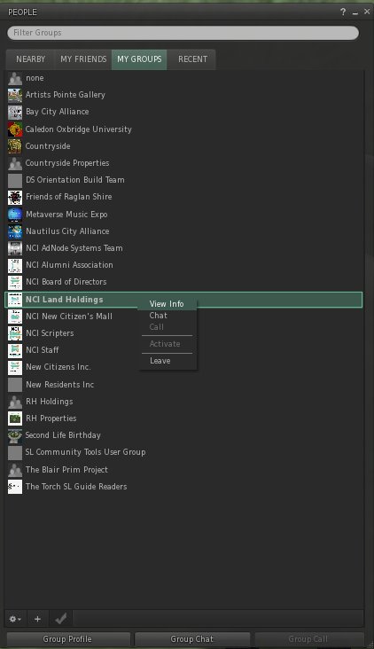 Once in the group, open up the 'My Groups' window using 'ctrl-g' or right click on yourself and select 'My Groups'